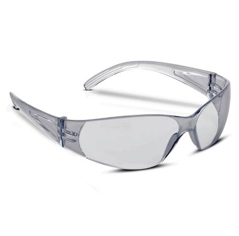 Protective spectacle with clear / grey hard coated lens and stylish polycarbonate temples. Spectacular design with optical class lens provides medium level impact protection.